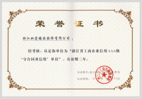 日前,,,,,,我公司再次被浙江省工商行政管理局续展认定为“浙江省工商企业AAA级‘守条约重信用’单位”。。。。。。。。